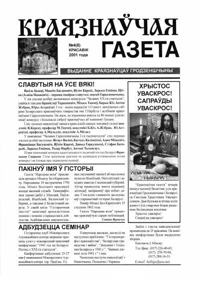 «Краязнаўчая газета» выдаецца з красавіка 2003 г. Штомесяц выходзіць чатыры нумары. На старонках выдання змяшчаюцца артыкулы мясцовых краязнаўцаў, прысвечаныя гісторыі і традыцыям рэгіёнаў нашай краіны, даследаванні навукоўцаў пра гісторыю, этнаграфію, фальклор і архітэктуру, пра гістарычныя падзеі і асобаў, а таксама расповяды пра нашых землякоў, якія праславіліся не толькі ў ў Беларусі, але і за яе межамі. Асобная ўвага надаецца публі... More »