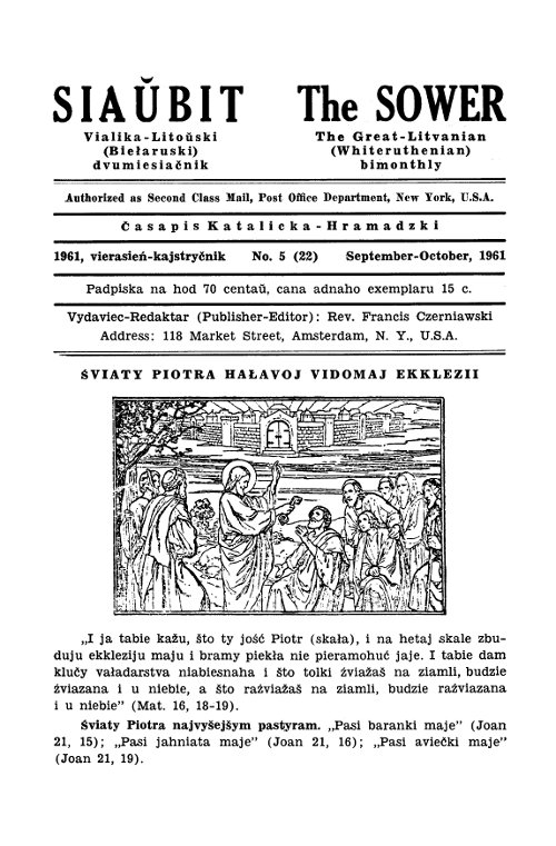 Siaŭbit. Vialika-Litoŭski (Biełaruski) dvumiesiačnik // Сяўбіт. Вяліка-Літоўскі (Беларускі) двумесячнік // The Sower. The Sower: the Great-Litvanian (Whiteruthenian) bimonthly. Каталіцка-грамадзкі часопіс. Выходзіў у Злучаных Штатах Амэрыкі з 1957 году. Яго рэдактарам быў беларускі рэлігійны дзеяч Францішак Чарняўскі. Душпастарскую службу пачаў у 1920 на пасадзе вікарыя ў Сухаволі. Служыў таксама ў Саколцы і ў Кузніцы. Чытаў казанні н... Болей »