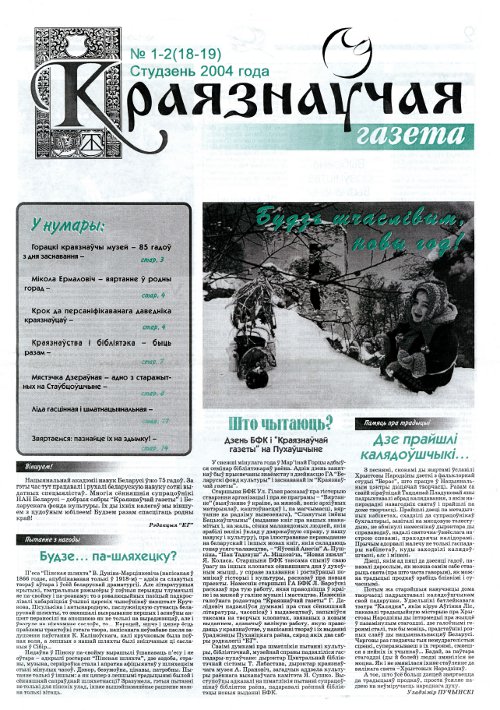 «Краязнаўчая газета» выдаецца з красавіка 2003 г. Штомесяц выходзіць чатыры нумары. На старонках выдання змяшчаюцца артыкулы мясцовых краязнаўцаў, прысвечаныя гісторыі і традыцыям рэгіёнаў нашай краіны, даследаванні навукоўцаў пра гісторыю, этнаграфію, фальклор і архітэктуру, пра гістарычныя падзеі і асобаў, а таксама расповяды пра нашых землякоў, якія праславіліся не толькі ў ў Беларусі, але і за яе межамі. Асобная ўвага надаецца публі... Болей »