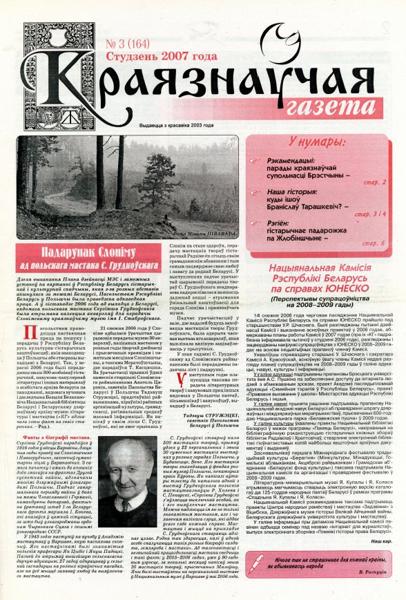 «Краязнаўчая газета» выдаецца з красавіка 2003 г. Штомесяц выходзіць чатыры нумары. На старонках выдання змяшчаюцца артыкулы мясцовых краязнаўцаў, прысвечаныя гісторыі і традыцыям рэгіёнаў нашай краіны, даследаванні навукоўцаў пра гісторыю, этнаграфію, фальклор і архітэктуру, пра гістарычныя падзеі і асобаў, а таксама расповяды пра нашых землякоў, якія праславіліся не толькі ў ў Беларусі, але і за яе межамі. Асобная ўвага надаецца публі... Болей »
