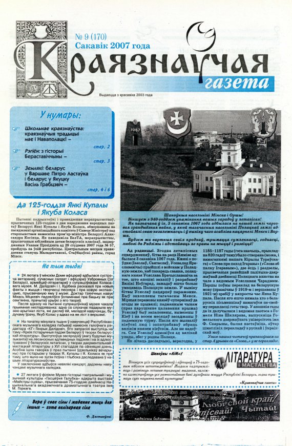 «Краязнаўчая газета» выдаецца з красавіка 2003 г. Штомесяц выходзіць чатыры нумары. На старонках выдання змяшчаюцца артыкулы мясцовых краязнаўцаў, прысвечаныя гісторыі і традыцыям рэгіёнаў нашай краіны, даследаванні навукоўцаў пра гісторыю, этнаграфію, фальклор і архітэктуру, пра гістарычныя падзеі і асобаў, а таксама расповяды пра нашых землякоў, якія праславіліся не толькі ў ў Беларусі, але і за яе межамі. Асобная ўвага надаецца публі... Болей »