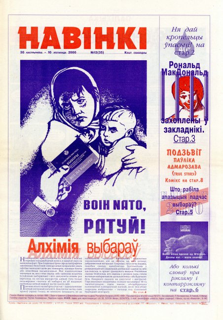 «Наві́нкі» — беларуская палітыка-сатырычная газэта. Заснаваная напачатку 1998 актывістамі анархічнай групоўкі «Чырвоны Жонд». Стылістыка — жорсткі трэшавы сьцёб з палітычных рэаліяў, кліпавы мантаж, палітычная карыкатура на грані непрыстойнасьці, максымальна ангажаваная падача навінаў, сатырычныя коміксы, палітычныя і культуралягічныя правакацыі. За правобраз газэты была ўзятая газэта «Навіны», назва і лягатып якой былі нязначна зьменен... Болей »