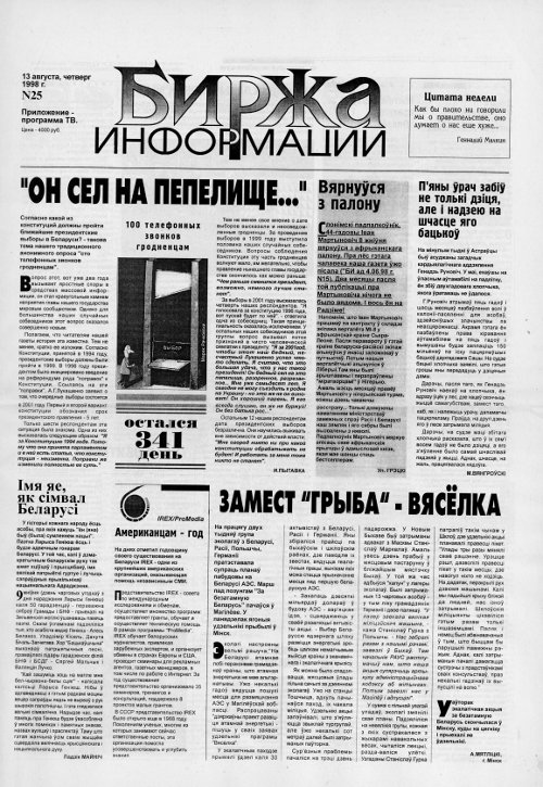 Грамадзка-палітычны тыднёвік "Биржа информации" выходзіў у Горадні з 1998 па 2005 год. Калі напрыканцы 2004 г. стала вядома, што "Биржа информации" у друкаваным выглядзе выходзіць ня бдузе, галоўны рэдактар тыднёвіка Елена Раўбецкая зьвярнулася да чытачоў з заклікам, у якім між іншым чытаем: «Типографии Беларуси отказались взять нас в печать. Поводы? Самые смешные. В Гродненской - новый директор, по образованию строитель и с печатным пр... Болей »