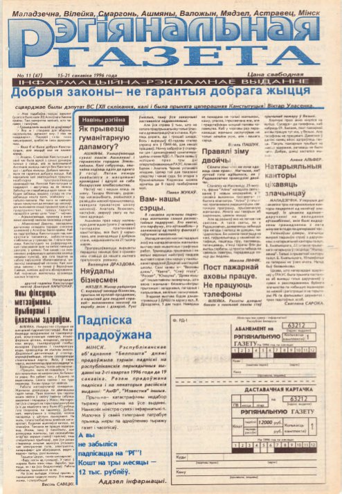 “Рэгіянальная газета” – недзяржаўнае выданне, якое не з’яўляецца выразнікам інтарэсаў і пазіцый якой-небудзь палітычнай партыі, рэлігійнай канфесіі, органаў улады. У сваіх публікацыях па пытаннях эканомікі, палітыкі, культуры, гісторыі, рэлігіі рэдакцыя захоўвае незалежную непрадузятасць і павагу да праўды, у роўнай ступені паказвае супрацьлеглыя пункты гледжання, пазбягаючы тэндэнцыйнасці. Выданне разлічанае на масавага чытача рознага ... Болей »