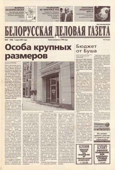 «Белорусская деловая газета» (па-беларуску: «Беларуская дзелавая газэта») — беларуская грамадзка-палітычная газэта, заснаваная ў 1992 годзе. Заснавальнікам і выдаўцом «БДГ» зьяўляецца Выдавецкае прыватнае вунітарнае прадпрыемства «Марат». «БДГ» — штодзённае незалежнае выданьне дзелавых і палітычных кругоў Беларусі. «БДГ» зьяўляецца адным з найболей аўтарытэтных незалежных СМІ Беларусі. За час дзейнасьці газэты ўладамі неаднаразова прадп... Болей »
