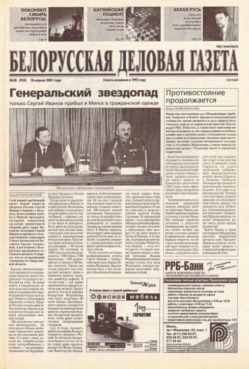 «Белорусская деловая газета» (па-беларуску: «Беларуская дзелавая газэта») — беларуская грамадзка-палітычная газэта, заснаваная ў 1992 годзе. Заснавальнікам і выдаўцом «БДГ» зьяўляецца Выдавецкае прыватнае вунітарнае прадпрыемства «Марат». «БДГ» — штодзённае незалежнае выданьне дзелавых і палітычных кругоў Беларусі. «БДГ» зьяўляецца адным з найболей аўтарытэтных незалежных СМІ Беларусі. За час дзейнасьці газэты ўладамі неаднаразова прадп... Болей »
