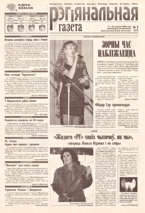 “Рэгіянальная газета” – недзяржаўнае выданне, якое не з’яўляецца выразнікам інтарэсаў і пазіцый якой-небудзь палітычнай партыі, рэлігійнай канфесіі, органаў улады. У сваіх публікацыях па пытаннях эканомікі, палітыкі, культуры, гісторыі, рэлігіі рэдакцыя захоўвае незалежную непрадузятасць і павагу да праўды, у роўнай ступені паказвае супрацьлеглыя пункты гледжання, пазбягаючы тэндэнцыйнасці. Выданне разлічанае на масавага чытача рознага ... Болей »