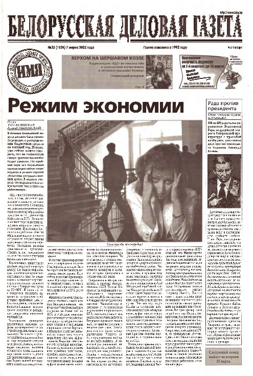 «Белорусская деловая газета» (па-беларуску: «Беларуская дзелавая газэта») — беларуская грамадзка-палітычная газэта, заснаваная ў 1992 годзе. Заснавальнікам і выдаўцом «БДГ» зьяўляецца Выдавецкае прыватнае вунітарнае прадпрыемства «Марат». «БДГ» — штодзённае незалежнае выданьне дзелавых і палітычных кругоў Беларусі. «БДГ» зьяўляецца адным з найболей аўтарытэтных незалежных СМІ Беларусі. За час дзейнасьці газэты ўладамі неаднаразова прадп... Болей »