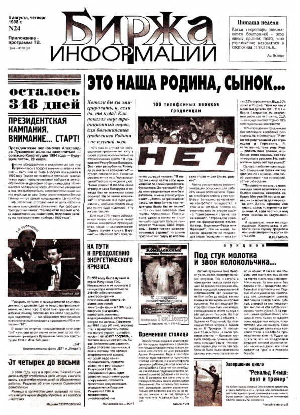 Грамадзка-палітычны тыднёвік "Биржа информации" выходзіў у Горадні з 1998 па 2005 год. Калі напрыканцы 2004 г. стала вядома, што "Биржа информации" у друкаваным выглядзе выходзіць ня бдузе, галоўны рэдактар тыднёвіка Елена Раўбецкая зьвярнулася да чытачоў з заклікам, у якім між іншым чытаем: «Типографии Беларуси отказались взять нас в печать. Поводы? Самые смешные. В Гродненской - новый директор, по образованию строитель и с печатным пр... Болей »