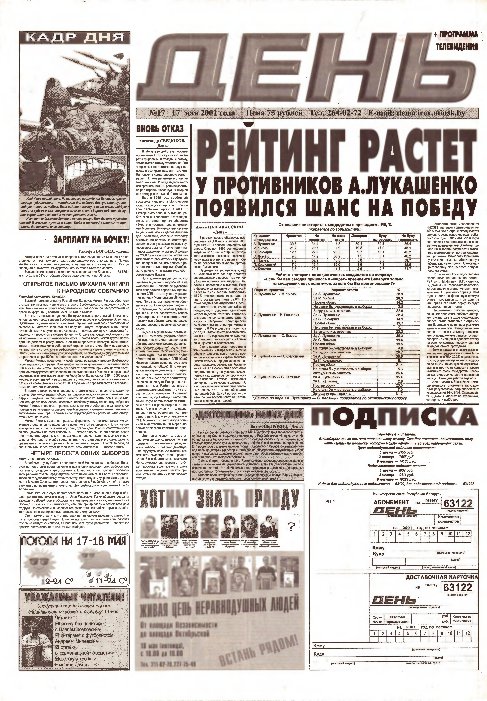 Незалежная беларуская газета "День" пачала выходзіць у красавіку 2001 года. Яе заснавальнікам было таварыства з дадатковай адказнасцю "Деньпресс". Галоўным рэдактарам першапачаткова быў Аляксандр Тамковіч. Апошні - перад вымушаным перапынкам - нумар газеты выйшаў у канцы ліпеня 2002 года. Газета аднавіла свой выхад 23 ліпеня 2003 году. Гэты нумар газеты, надрукаваны накладам 5 тысяч асобнікаў, цалкам прысьвечаны быў асобе Васіля Быкава.... Болей »