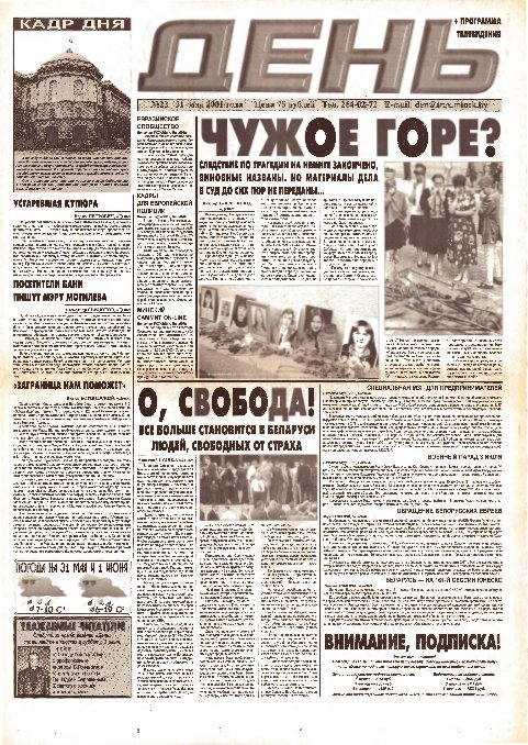 Незалежная беларуская газета "День" пачала выходзіць у красавіку 2001 года. Яе заснавальнікам было таварыства з дадатковай адказнасцю "Деньпресс". Галоўным рэдактарам першапачаткова быў Аляксандр Тамковіч. Апошні - перад вымушаным перапынкам - нумар газеты выйшаў у канцы ліпеня 2002 года. Газета аднавіла свой выхад 23 ліпеня 2003 году. Гэты нумар газеты, надрукаваны накладам 5 тысяч асобнікаў, цалкам прысьвечаны быў асобе Васіля Быкава.... Болей »