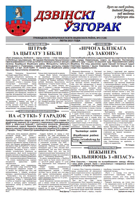 «Калі ўладарыць бязбожнік – народ стогне» – гэтак гаворыцца ў біблійных прыпавесцях. 56-гадовая Валянціна Крыштопенка сфатаграфавалася з гэтай цытатай на плакаце ў розных месцах пасёлку Акцябрьскі Віцебскага раёну. Міліцыянты пабачылі фотаздымкі ў «Тэлеграме» і завялі супраць жанчыны справу паводле ч.3 арт. 23.34 КаАП. 11 лютага суд Віцебскага раёну прызнаў Крыштопенку вінаватай… Справу Валянціны Крыштопенкі разглядаў суддзя Міхаіл Зубеня. Паводле міліцэйскага пратаколу, 24 снежня 2020 году жанчына, аказваецца, «узяла ўдзел у несанкцыянаваным пікетаванні»: «стаяла з плакатам «Когда господствует нечестивый, народ стенает» у розных месцах пасёлку». На думку супрацоўнікаў МУС, гэтым самым Крыштопенка і парушыла заканадаўства аб масавых мерапрыемствах. Міліцыянты сцвярджалі, што відэаролік, створаны на падставе фотаздымкаў, быў размешчаны абвінавачанай у тэлеграм-канале «Віцебск 97%». Валянціна Крыштопенка сваёй віны не прызнала і заявіла, што ролік у «Тэлеграме» не размяшчала. На яе погляд, артыкул 23.34 быў ужыты да яе неправамерна. «Біблія ў Беларусі не забароненая!» – канстатавала яна на судзе.