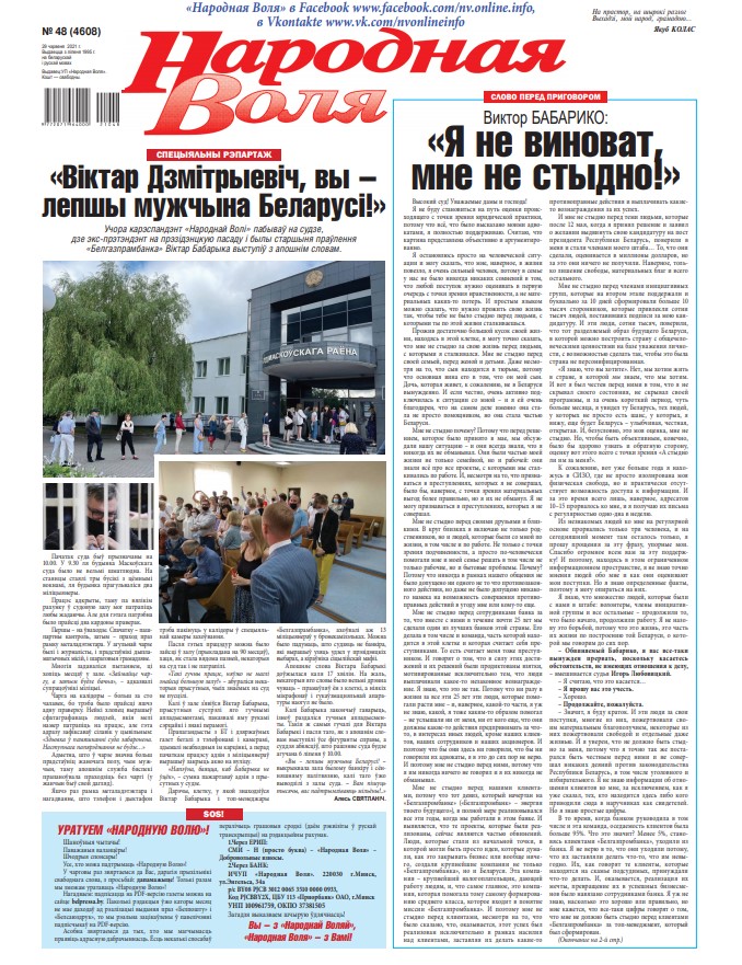 Высокий суд! Уважаемые дамы и господа! Я не буду становиться на путь оценки происходящего с точки зрения юридической практики, потому что всё, что было высказано моими адвокатами, я полностью поддерживаю. Считаю, что картина представлена объективно и аргументированно. Я остановлюсь просто на человеческой ситуации и могу сказать, что мне, наверное, в жизни повезло, я очень сильный человек, потому в семье у нас не было никогда никаких сомнений в том, что любой поступок нужно оценивать в первую очередь с точки зрения нравственности, а не материальных каких-то потерь. И простым языком можно сказать, что нужно прожить свою жизнь так, чтобы тебе не было стыдно перед людьми, с которыми ты по этой жизни сталкиваешься. Прожив достаточно большой кусок своей жизни, находясь в этой клетке, я могу точно сказать, что мне не стыдно за свою жизнь перед людьми, с которыми я сталкивался. Мне не стыдно перед своей семьей, перед женой и детьми. Даже несмотря на то, что сын находится в тюрьме, потому что основная вина его в том, что он мой сын. Дочь, которая живет, к сожалению, не в Беларуси вынужденно. И если честно, очень активно подключилась к ситуации со мной – и я ей очень благодарен, что на самом деле именно она стала не просто помощником, но она стала частью Беларуси. Мне не стыдно почему?