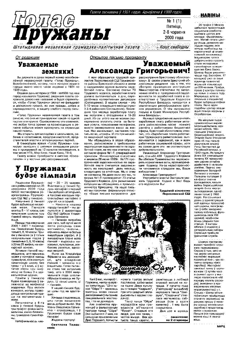 «Голас Пружаны» штотыднёвая незалежная грамадска-палітычная газета. Газета заснаваная ў 1931 годзе, адноўленая ў 1999 годзе. Заснавальнік і рэдактар Язэп Машкала. Газета друкуецца на беларускай і рускай мовах. Аўтары апублікаваных матэрыялаў нясуць асабістую адказнасць за падбор і дакладнаць фактаў, іх меркаванні могуць не супадаць з поглядам рэдакцыі. Болей »