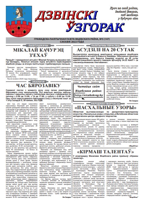 Старшыня Віцебскага райвыканкама Генадзь Сабыніч расказаў аб асаблівасцях цяперашняй гарачай пары. Дваццаць шосты год не перарываецца традыцыя ўдзелу Віцебскага раёна ў фестывалях-кірмашах працаўнікоў вёскі "Дажынкі" рэспубліканскага і абласнога ўзроўняў. Пастаянна з 1996 года аграрыі Прыдзвінскага краю станавіліся пераможцамі ў розных намінацыях маштабнага сельскагаспадарчага форуму. Апошніх некалькі гадоў раён утрымлівае лідэрства ў а... Болей »