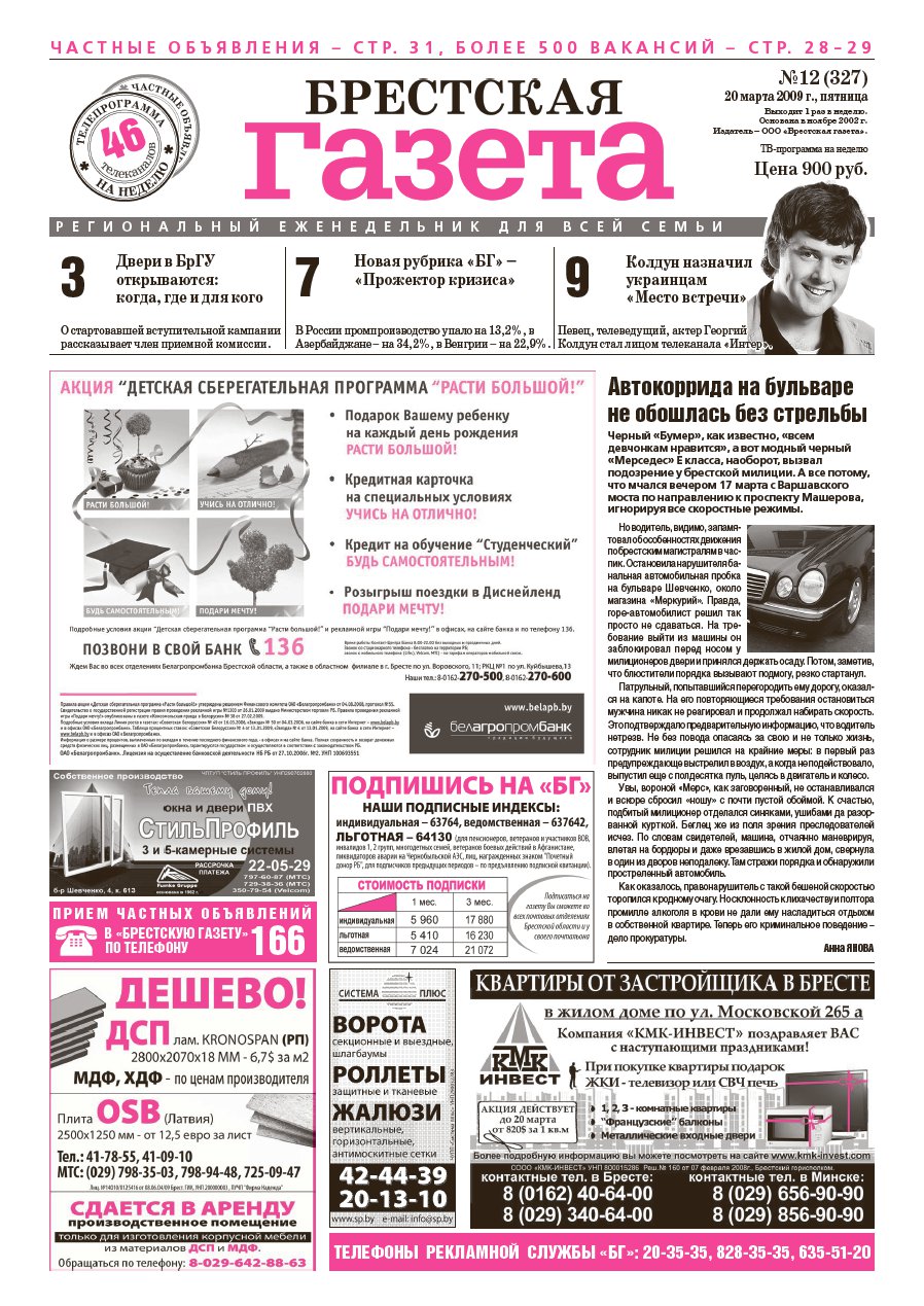 «Брестская газета» на региональном рынке СМИ позиционирует себя как одна газета для всей семьи. При выборе тематики публикуемых материалов мы руководствуемся принципом: ШИРОКИЙ ВЗГЛЯД, ВНИМАНИЕ К ДЕТАЛЯМ. При этом фундаментальной основой всех публикаций является: ОБЪЕКТИВНОСТЬ. Основными составляющими в содержательном плане являются местные новости, материалы социально-бытовой, экономической и правовой направленности. Болей »