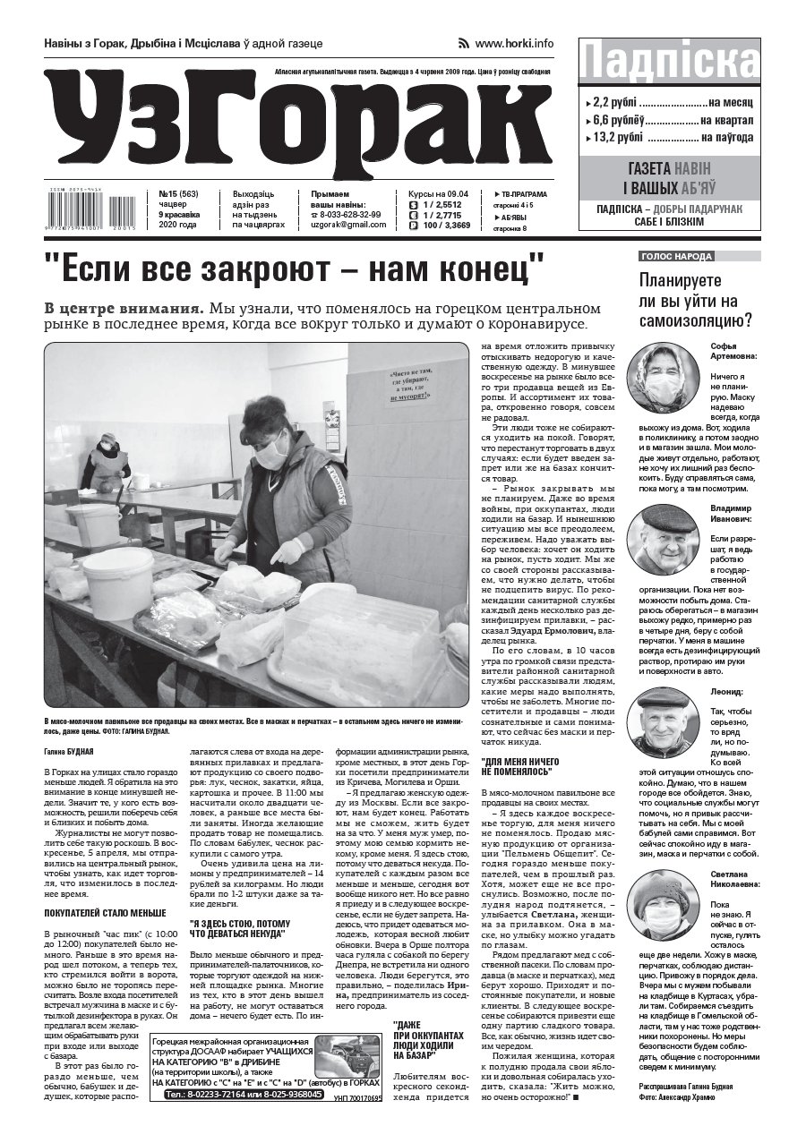 Абласная газета "УзГорак" выходзіць і прадаецца ў Горацкім, Дрыбінскім і Мсціслаўскім раёнах па чацвяргах. Наклад – 2100 асобнікаў на тыдзень. Актуальныя для мясцовых жыхароў тэмы, штотыднёвыя апытанні гараджан, фотарэпартажы, праграма любімых тэлеканалаў, сканворды, прыватныя аб'явы, астрапрагноз і віншаванні. Болей »