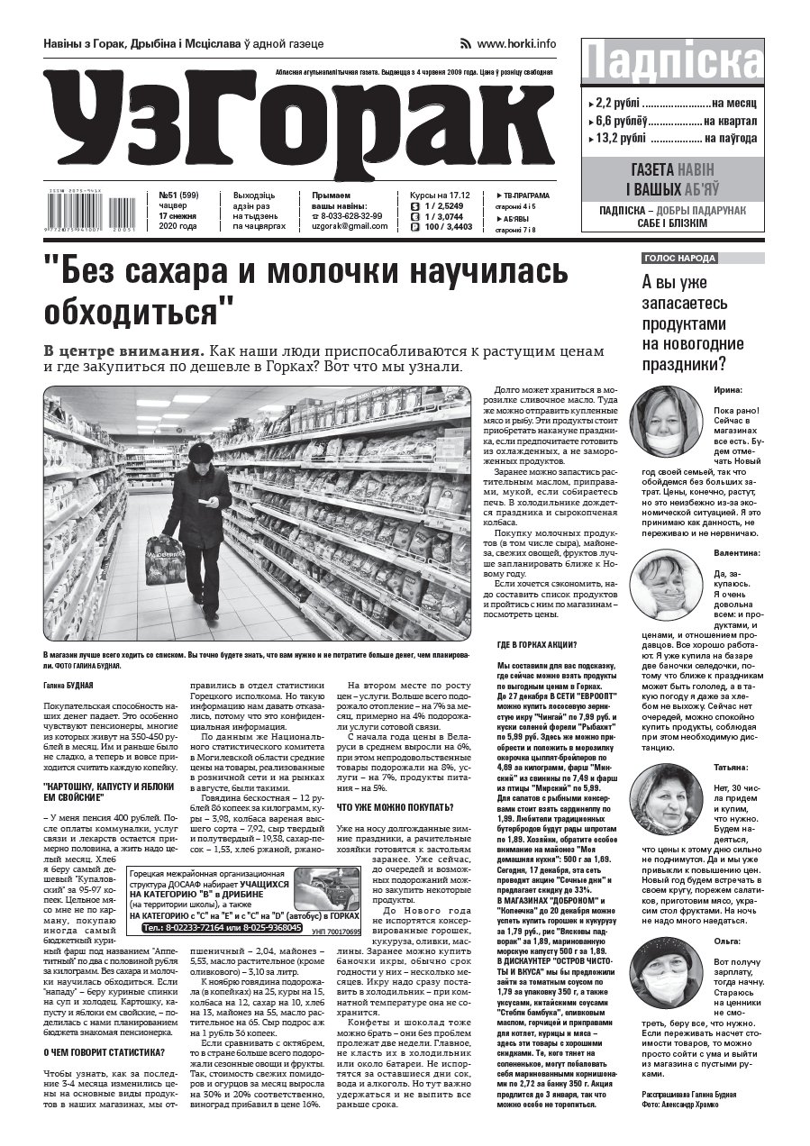 Абласная газета "УзГорак" выходзіць і прадаецца ў Горацкім, Дрыбінскім і Мсціслаўскім раёнах па чацвяргах. Наклад – 2100 асобнікаў на тыдзень. Актуальныя для мясцовых жыхароў тэмы, штотыднёвыя апытанні гараджан, фотарэпартажы, праграма любімых тэлеканалаў, сканворды, прыватныя аб'явы, астрапрагноз і віншаванні. Болей »