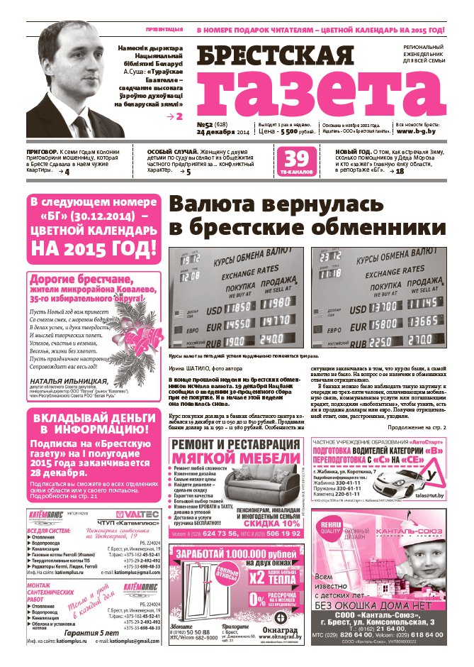 «Брестская газета» на региональном рынке СМИ позиционирует себя как одна газета для всей семьи. При выборе тематики публикуемых материалов мы руководствуемся принципом: ШИРОКИЙ ВЗГЛЯД, ВНИМАНИЕ К ДЕТАЛЯМ. При этом фундаментальной основой всех публикаций является: ОБЪЕКТИВНОСТЬ. Основными составляющими в содержательном плане являются местные новости, материалы социально-бытовой, экономической и правовой направленности. Болей »