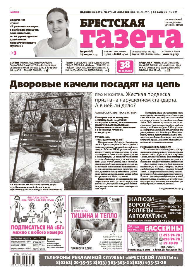 «Брестская газета» на региональном рынке СМИ позиционирует себя как одна газета для всей семьи. При выборе тематики публикуемых материалов мы руководствуемся принципом: ШИРОКИЙ ВЗГЛЯД, ВНИМАНИЕ К ДЕТАЛЯМ. При этом фундаментальной основой всех публикаций является: ОБЪЕКТИВНОСТЬ. Основными составляющими в содержательном плане являются местные новости, материалы социально-бытовой, экономической и правовой направленности. Болей »
