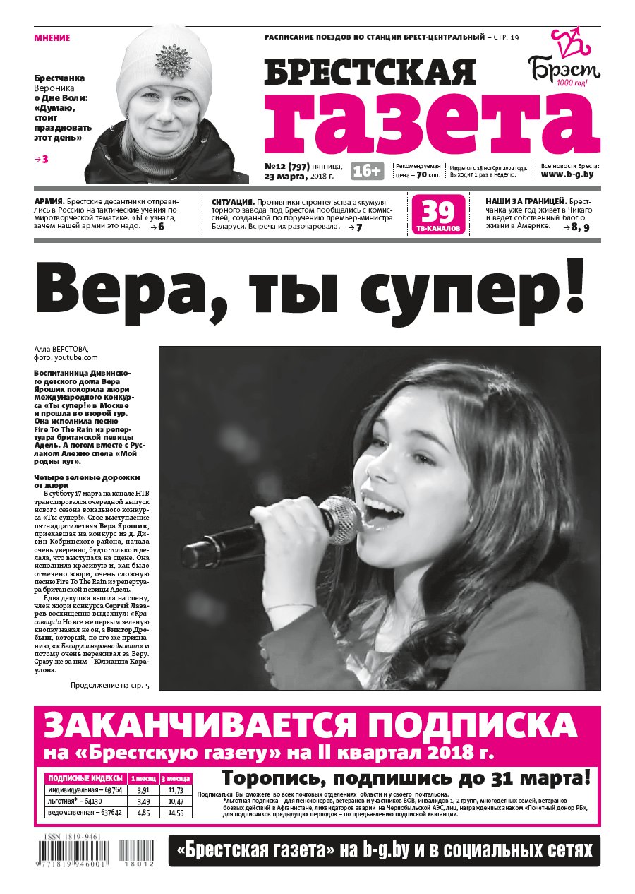 «Брестская газета» на региональном рынке СМИ позиционирует себя как одна газета для всей семьи. При выборе тематики публикуемых материалов мы руководствуемся принципом: ШИРОКИЙ ВЗГЛЯД, ВНИМАНИЕ К ДЕТАЛЯМ. При этом фундаментальной основой всех публикаций является: ОБЪЕКТИВНОСТЬ. Основными составляющими в содержательном плане являются местные новости, материалы социально-бытовой, экономической и правовой направленности. Болей »