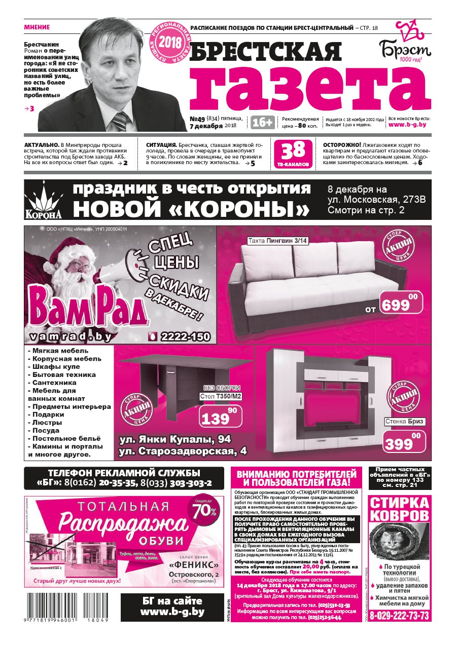 «Брестская газета» на региональном рынке СМИ позиционирует себя как одна газета для всей семьи. При выборе тематики публикуемых материалов мы руководствуемся принципом: ШИРОКИЙ ВЗГЛЯД, ВНИМАНИЕ К ДЕТАЛЯМ. При этом фундаментальной основой всех публикаций является: ОБЪЕКТИВНОСТЬ. Основными составляющими в содержательном плане являются местные новости, материалы социально-бытовой, экономической и правовой направленности. Болей »