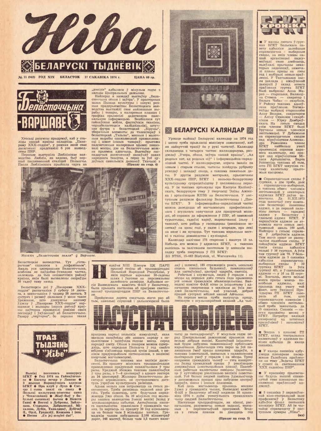 «Ніва» — штотыднёвая газета, якая выдаецца на беларускай мове ў Беластоку. Газета была заснавана ў 1956 Беларускім грамадска-культурным таварыствам. Зараз яе выдае Праграмная рада тыднёвіка «Ніва». Газета асвятляе штодзённае жыццё беларусаў у Польшчы, дзейнасць грамадскіх арганізацый, друкуе матэрыялы па краязнаўстве, змяшчае артыкулы, прысвечаныя актуальным падзеям на Беларусі. More »