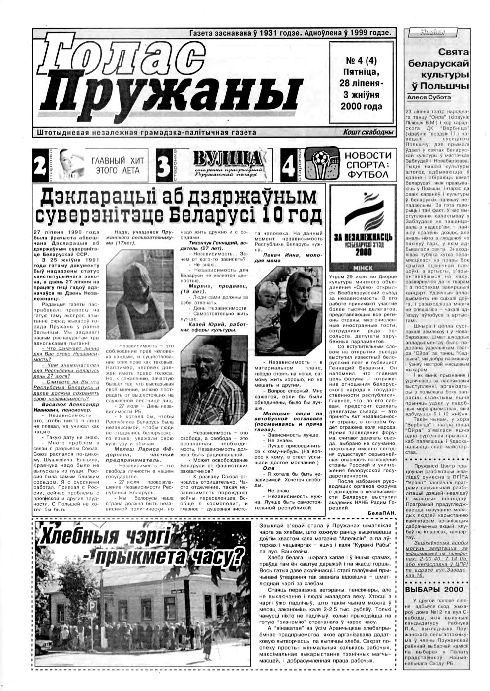«Голас Пружаны» штотыднёвая незалежная грамадска-палітычная газета. Газета заснаваная ў 1931 годзе, адноўленая ў 1999 годзе. Заснавальнік і рэдактар Язэп Машкала. Газета друкуецца на беларускай і рускай мовах. Аўтары апублікаваных матэрыялаў нясуць асабістую адказнасць за падбор і дакладнаць фактаў, іх меркаванні могуць не супадаць з поглядам рэдакцыі. More »