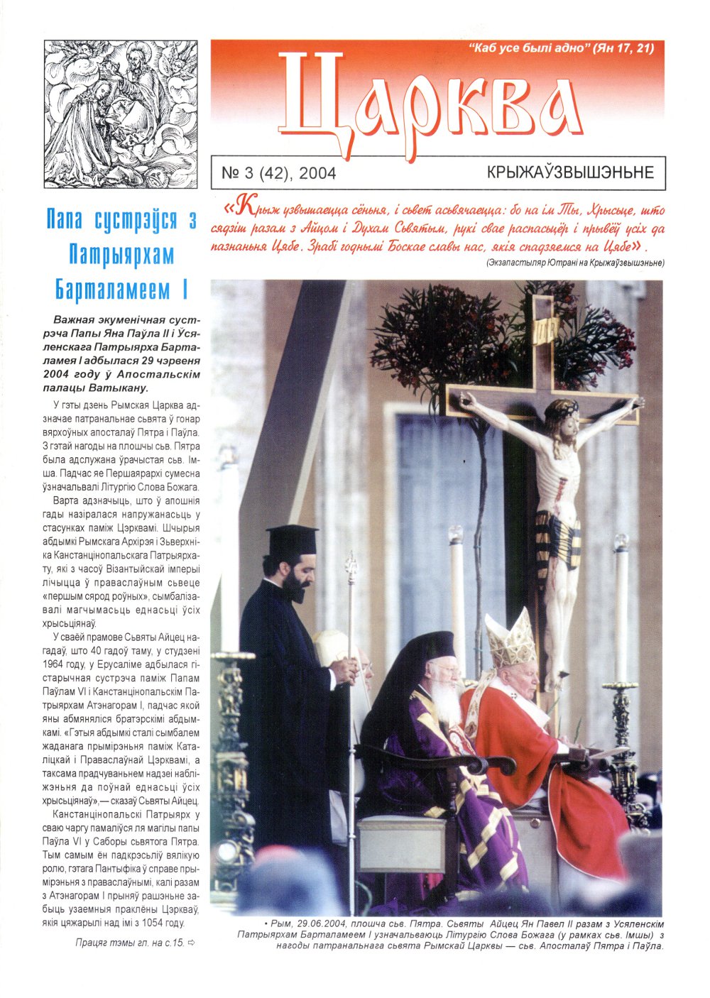 «Царква» — беларуская рэлігійная культурна-асветніцкая газета, квартальнік. Газета асвятляе жыццё грэка-каталіцкіх супольнасцяў у Беларусі і ў іншых краінах свету, змяшчае афіцыйныя дакументы Царквы, удзяляе ўвагу праблемам экуменізму і хрысціянскай еднасці, друкуе матэрыялы па гісторыі Уніяцкай Царквы і іншую рэлігійна-асветніцкую інфармацыю. Беларуская грэка-каталіцкая газета «Царква» заснавана мінскімі грэка-каталіцкімі парафіямі ў 1... Болей »
