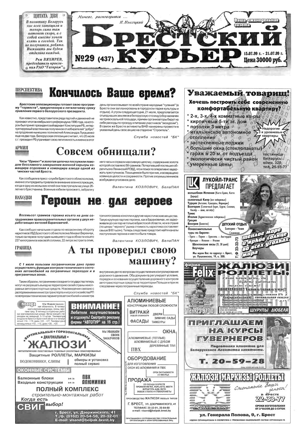 «Брестский курьер» — Ваша еженедельная газета. Газета основана в 1913 возрождена в 1990 г. Рукописи не рецензируются и не возвращаются. Редакция оставляет за собой право не вступать в переписку с читателями. Ответственность за подбор фактов и изложение материалов несут авторы. Высказанные в этих статьях мнения могут не совпадать с точкой зрения редакции "БК" и не налагают на неё никаких обязательств. Выходит один раз в неделю. Газета распространяется в г. Бресте и районах области, а также во всех областных центрах Беларуси.