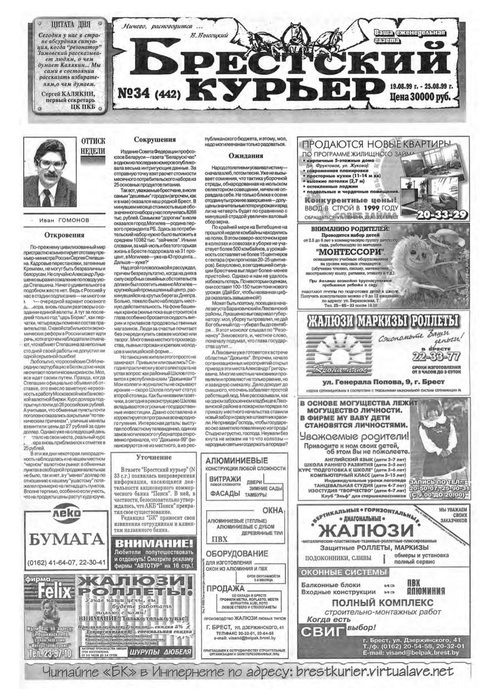 «Брестский курьер» — Ваша еженедельная газета. Газета основана в 1913 возрождена в 1990 г. Рукописи не рецензируются и не возвращаются. Редакция оставляет за собой право не вступать в переписку с читателями. Ответственность за подбор фактов и изложение материалов несут авторы. Высказанные в этих статьях мнения могут не совпадать с точкой зрения редакции "БК" и не налагают на неё никаких обязательств. Выходит один раз в неделю. Газета распространяется в г. Бресте и районах области, а также во всех областных центрах Беларуси.