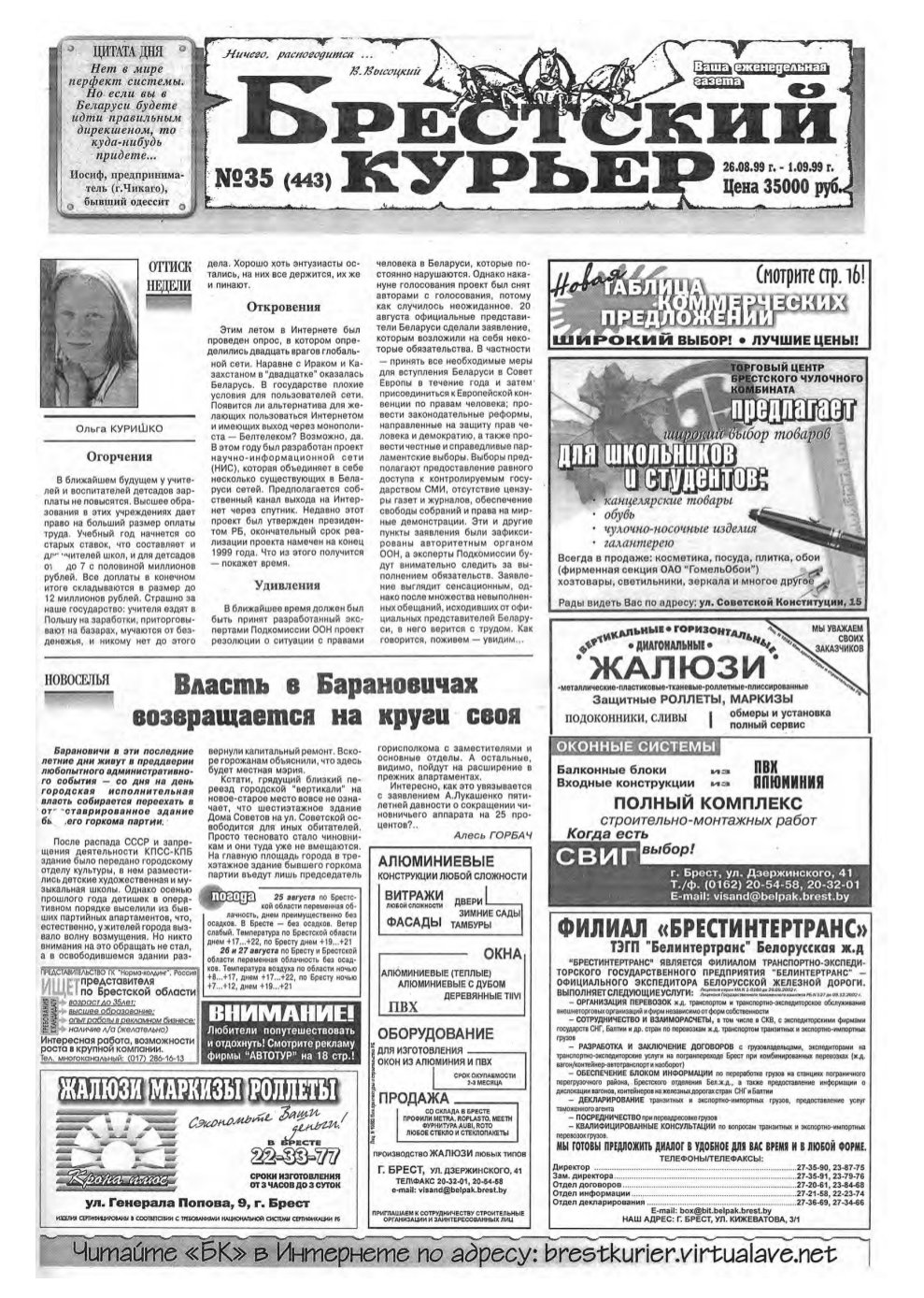 «Брестский курьер» — Ваша еженедельная газета. Газета основана в 1913 возрождена в 1990 г. Рукописи не рецензируются и не возвращаются. Редакция оставляет за собой право не вступать в переписку с читателями. Ответственность за подбор фактов и изложение материалов несут авторы. Высказанные в этих статьях мнения могут не совпадать с точкой зрения редакции "БК" и не налагают на неё никаких обязательств. Выходит один раз в неделю. Газета распространяется в г. Бресте и районах области, а также во всех областных центрах Беларуси.
