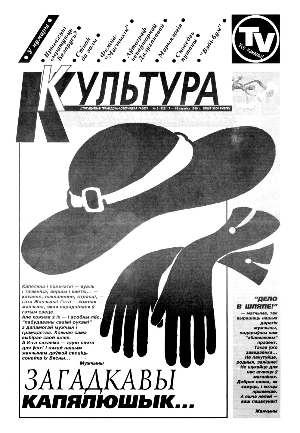 «Культура» — штотыднёвая грамадска-асветніцкая газета. Выдаецца з кастрычніка 1991 года ў Мінску на беларускай мове. Заснавальнік — Міністэрства культуры Рэспублікі Беларусь. З 2002 года з'яўляецца часткай рэдакцыйна-выдавецкай ўстановы «Культура і мастацтва», куды ўваходзіць разам з часопісам «Мастацтва». Болей »