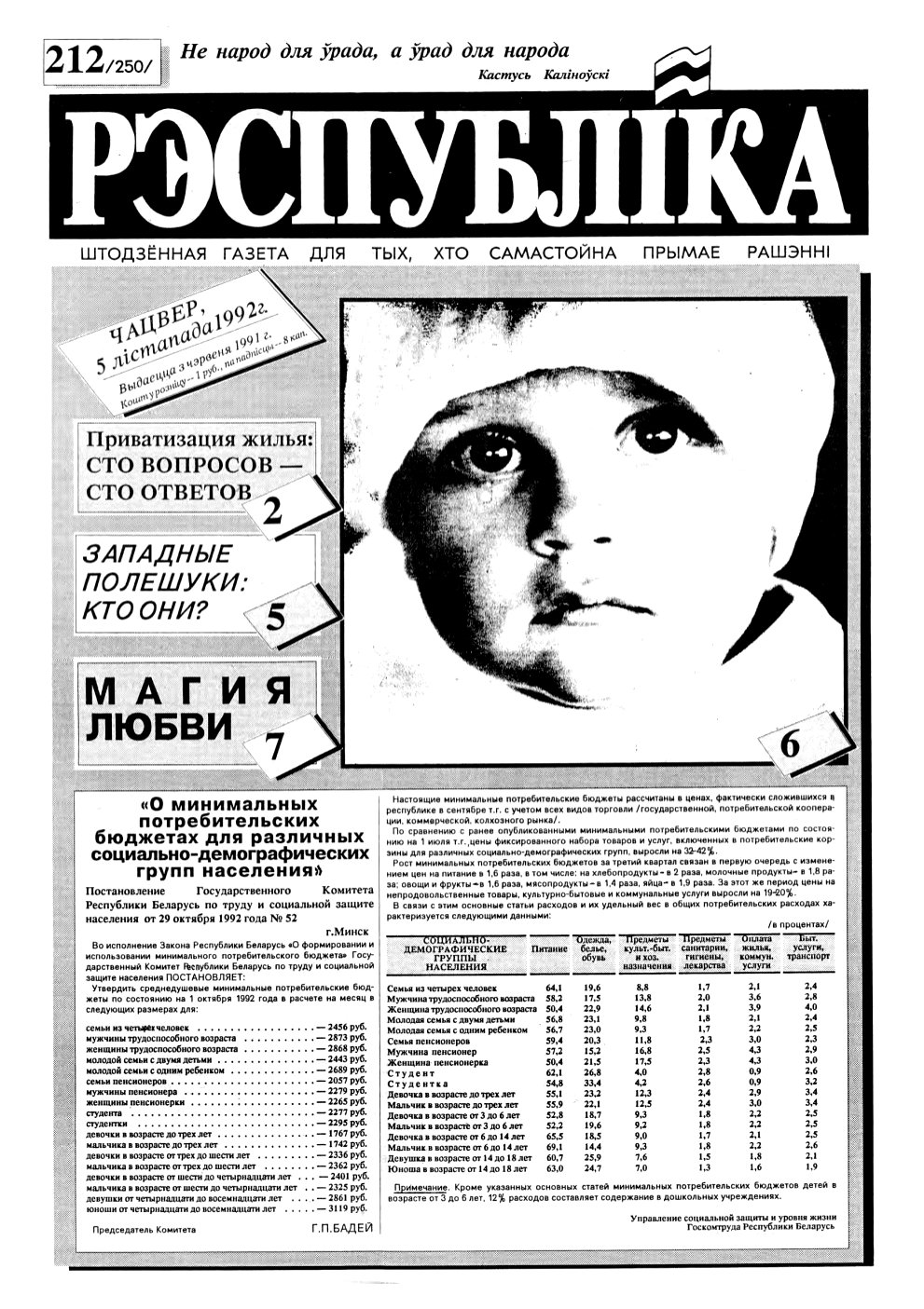 «Рэспубліка» — газета для тых, хто самастойна прымае рашэнні. Заснавальнік - Савет Міністраў Рэспублікі Беларусь. Выдаецца з чэрвеня 1991. Газета выходзіць 250 разоў у год. Аўтары апублікаваных матэрыялаў нясуць адказнасць за падбор і дакладнасць фактаў, іх меркаванні неабавязкова адлюстроўваюць пункт гледжання рэдакцыі. Рукапісы, фотаздымкі і малюнкі не рэцэнзуюцца і не вяртаюцца. Болей »