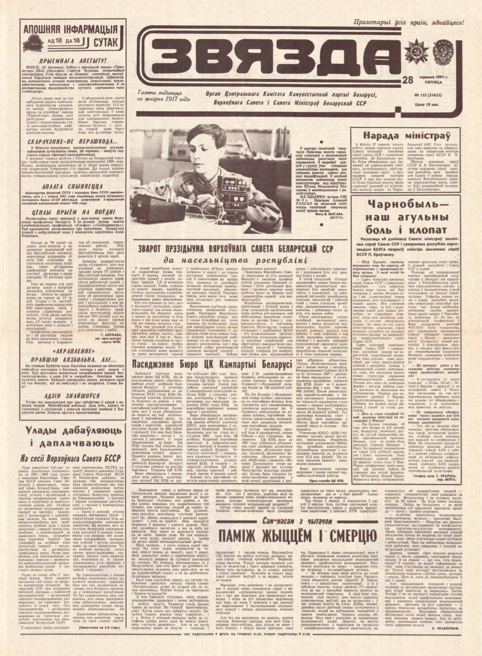«Звязда» — орган Цэнтральнага Камітэта Камуністычнай партыі Беларусі, Вярхоўнага Савета і Савета Міністраў Беларускай ССР. Выходзіць 250 разоў на год. Аўтары апублікаваных матэрыялаў нясуць адказнасць за падбор і дакладнасць фактаў. Іх меркаванні неабавязкова адлюстроўваюць пункт гледжання рэдакцыі. Болей »