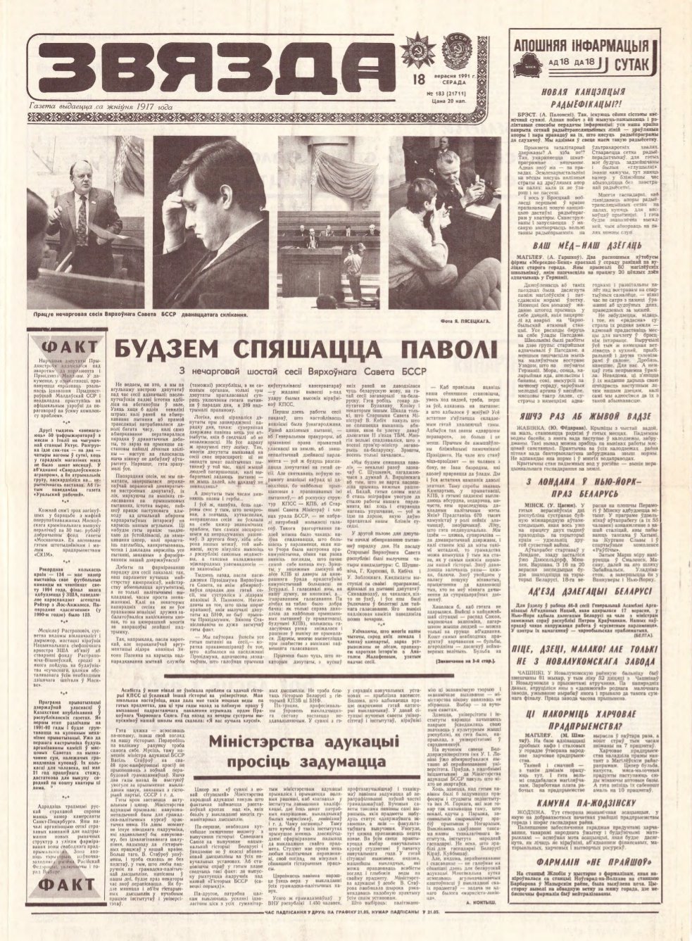 «Звязда» — орган Цэнтральнага Камітэта Камуністычнай партыі Беларусі, Вярхоўнага Савета і Савета Міністраў Беларускай ССР. Выходзіць 250 разоў на год. Аўтары апублікаваных матэрыялаў нясуць адказнасць за падбор і дакладнасць фактаў. Іх меркаванні неабавязкова адлюстроўваюць пункт гледжання рэдакцыі. More »