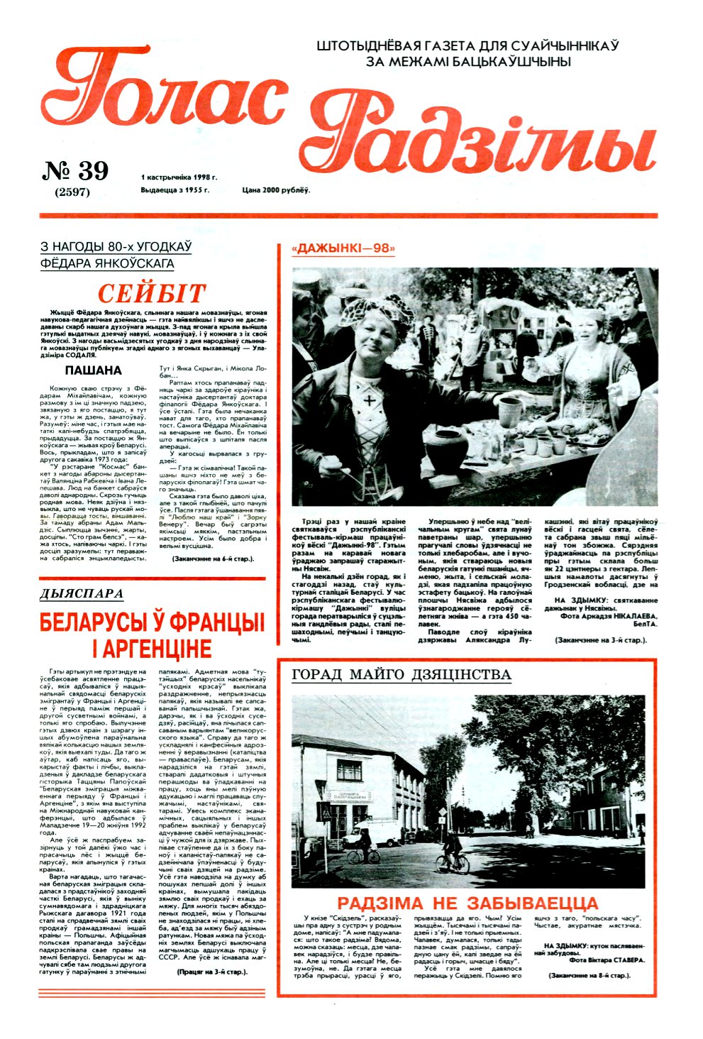 «Голас Радзімы» — штотыднёвая газета для суайчыннікаў за межамі Беларусі. Выдаецца з 6 красавіка 1955 года ў Мінску на беларускай мове штотыднёва. Да студзеня 1960 года называлася «За вяртанне на Радзіму». З сярэдзіны 1970-х гадоў асвятляла жыццё, у тым ліку беларускай эміграцыі. З сярэдзіны 1990-х гадоў адзінае беларускае выданне, якое распаўсюджвалася сярод нацыянальнай дыяспары і ў асяроддзі замежных беларусістаў. Болей »