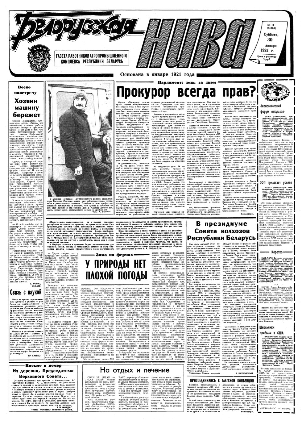 «Белорусская нива» — газета работников Агропромышленного комплекса Республики Беларусь. Учредители: Совет Министров Республики Беларусь и коллектив редакции «Белорусской нивы». За час існавання выданне не раз мяняла назву, мову, арфаграфічныя прынцыпы: спачатку называлася “Белорусская деревня” (на рускай мове), з 1922 г. выходзіла як дадатак да газеты “Звязда”, у 1924 г. яна стала самастойнай і называлася “Беларуская вёска” (на беларуск... Болей »