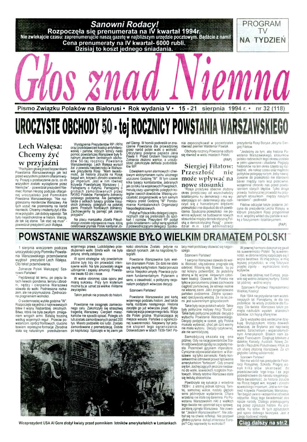 Głos znad Niemna – polskojęzyczny tygodnik wydawany na Białorusi od 3 grudnia 1989 roku; organ prasowy Związku Polaków na Białorusi. Twórcą i pierwszym redaktorem pisma był Eugeniusz Skrobocki z Grodna. Dzięki jego zaangażowaniu pierwsze numery „Głosu znad Niemna” otrzymał Papież Jan Paweł II podczas prywatnej audiencji władz Związku w Watykanie w roku 1990. Pierwszy numer ukazał się jako dodatek specjalny do Czerwonego Sztandaru z okaz... Болей »