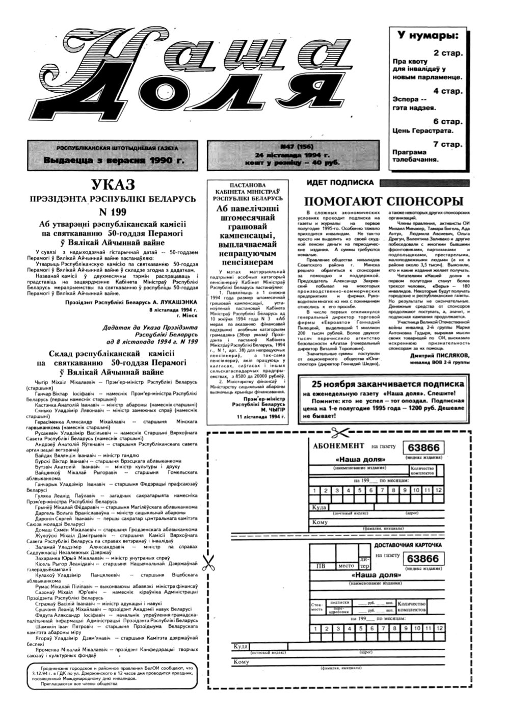 «Наша доля» — рэспубліканская штодзённая газета. Выходзіць штотыднёва на беларускай і рускай мовах. Аўтары нясуць адказнасць за прыведзеныя факты, цытаты, эканамічныя звесткі, дакладнасць іншай інфармацыі. Заснавальнік — Цэнтральнае праўленне Беларускага таварыства інвалідаў. Галоўны рэдактар А. А. Канопліч. Болей »