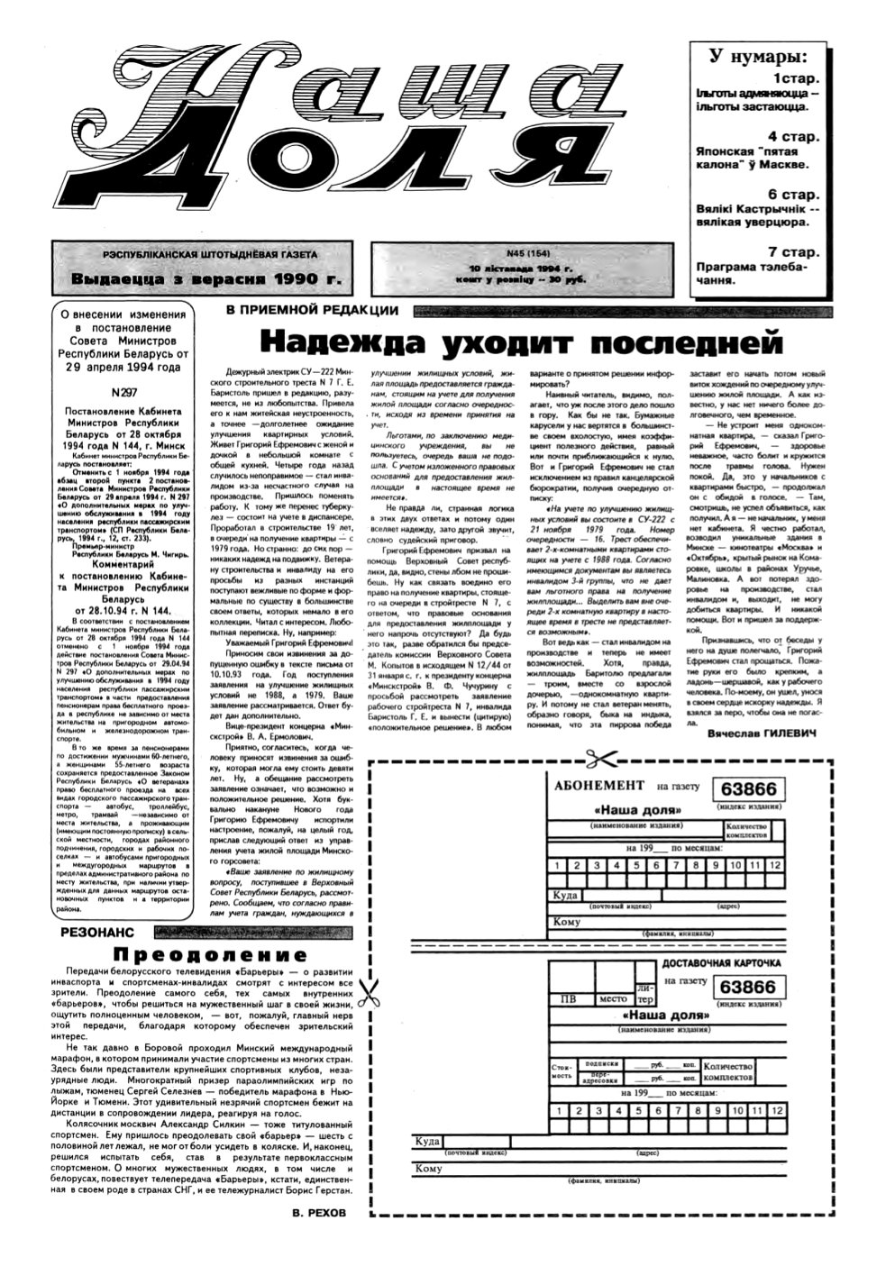 «Наша доля» — рэспубліканская штодзённая газета. Выходзіць штотыднёва на беларускай і рускай мовах. Аўтары нясуць адказнасць за прыведзеныя факты, цытаты, эканамічныя звесткі, дакладнасць іншай інфармацыі. Заснавальнік — Цэнтральнае праўленне Беларускага таварыства інвалідаў. Галоўны рэдактар А. А. Канопліч. Болей »