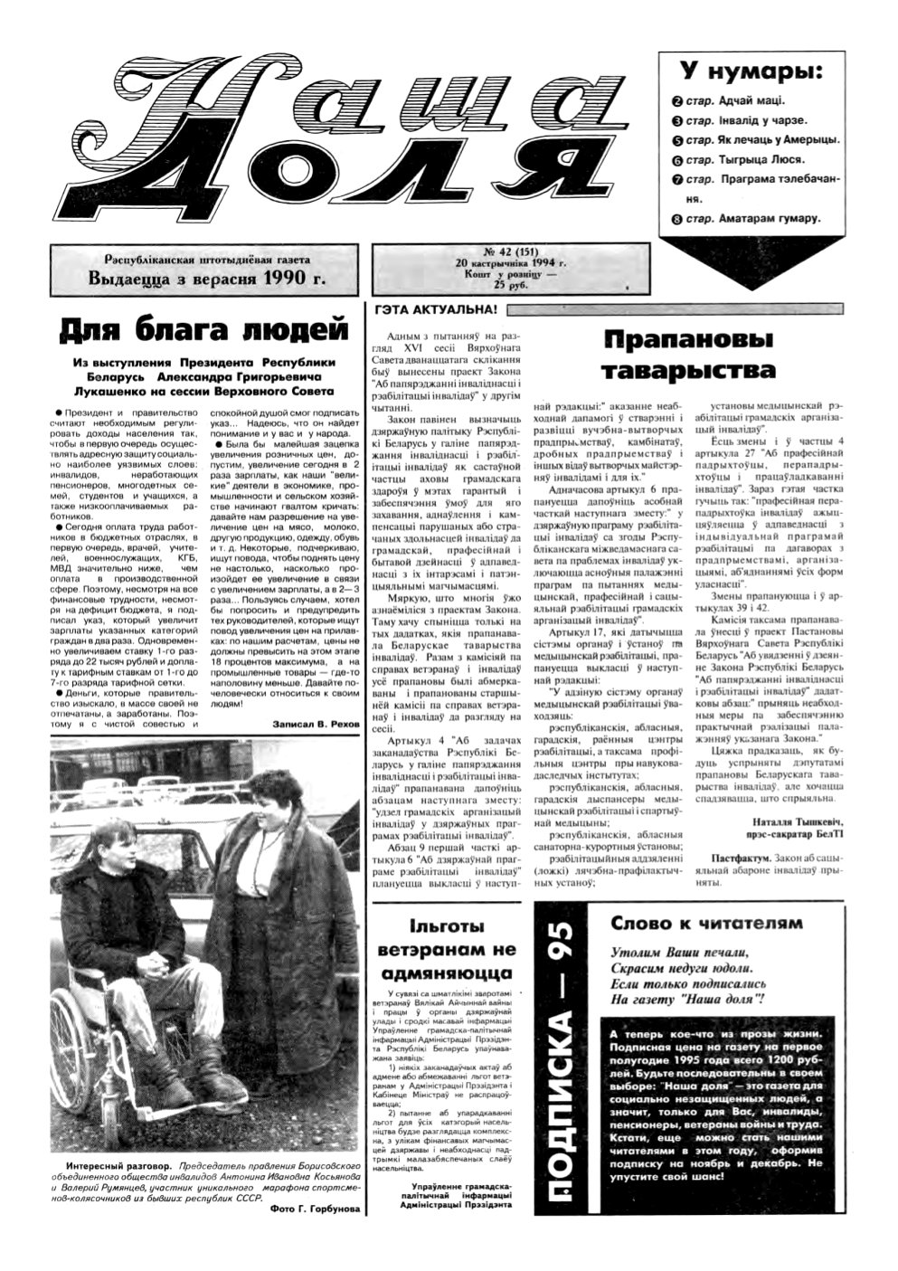 «Наша доля» — рэспубліканская штотыднёвая газета. Выдаецца з верасня 1990 года. Заснавальнік — Цэнтральнае праўленне Беларускага таварыства інвалідаў. Выходзіць штотыднёва на беларускай і рускай мовах. Рэдакцыя прымае заказы ад прадпрыемстваў, устаноў, кааператываў і асобных грамадзян на змяшчэнне аб'яў, рэкламы. Рэдакцыя не вядзе прыватнай перапіскі, рукапісы не вяртае, не рэцэнзуе. Аўтары нясуць адказнасць за прыведзеныя факты, цытаты... More »