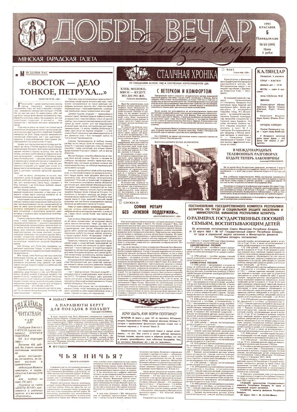 «Добры вечар» — мінская гарадская газета. Выдаеццап з лістапада 1990. Заснавальнік: Мінскі гарадскі Савет народных дэпутатаў. Аўтары змешчаных матэрыялаў нясуць адказнасць за падбор і дакладнасць прыведзеных фактаў, цытат, эканамічных даных, асабістых імён, геаграфічных назваў і іншай інфармацыі, а таксама за тое, каб у матэрыялах не ўтрымлівалася звестак, якія не падлягаюць адкрытай публікацыі. Допісы, атрыманыя рэдакцыяй, не рэцэнзуюц... Болей »