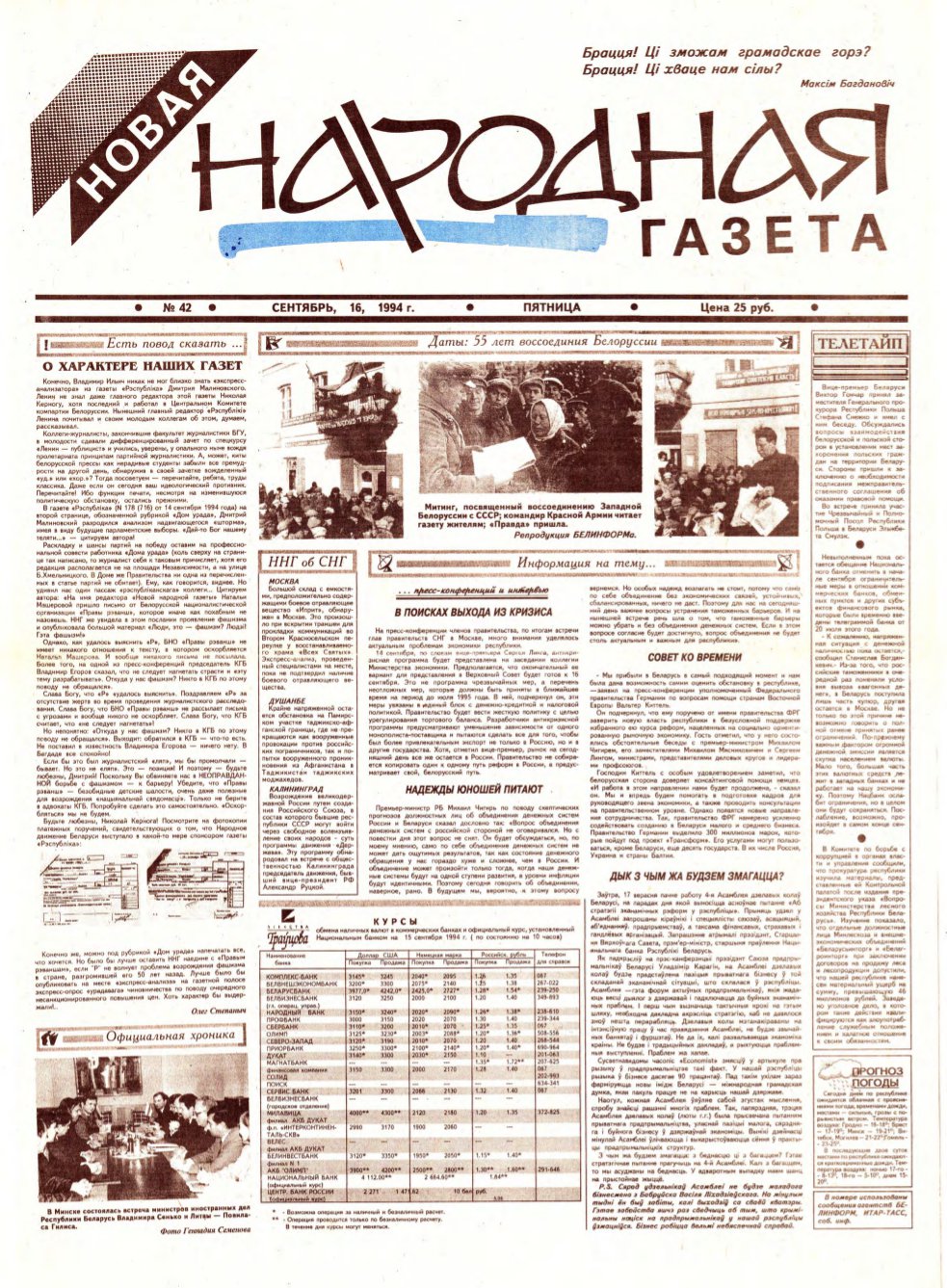 «Новая народная газета» — Учредитель — Координационный комитет Народного движения Беларуси. Главный редактор:Наталья Петровна Машерова. Газета издается на русском и белорусском языках. Мнения авторов опубликованных материалов могут не совпадать с позицией редакции. При перепечатке ссылка на ННГ обязательна.