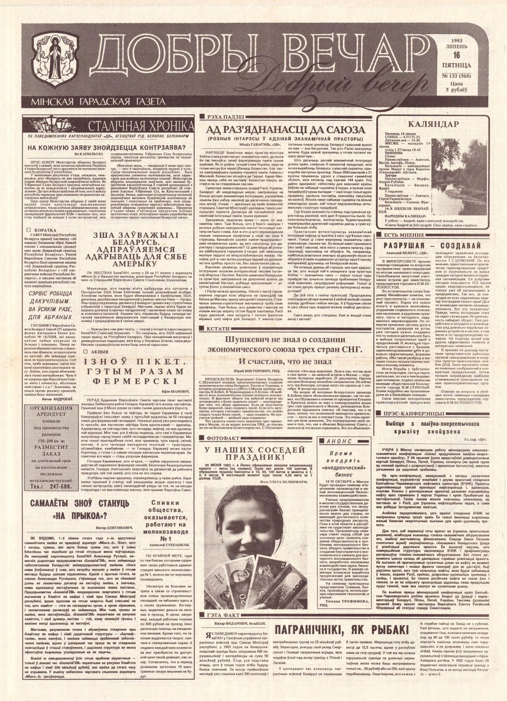 «Добры вечар» — мінская гарадская газета. Выдаеццап з лістапада 1990. Заснавальнік: Мінскі гарадскі Савет народных дэпутатаў. Аўтары змешчаных матэрыялаў нясуць адказнасць за падбор і дакладнасць прыведзеных фактаў, цытат, эканамічных даных, асабістых імён, геаграфічных назваў і іншай інфармацыі, а таксама за тое, каб у матэрыялах не ўтрымлівалася звестак, якія не падлягаюць адкрытай публікацыі. Допісы, атрыманыя рэдакцыяй, не рэцэнзуюц... Болей »