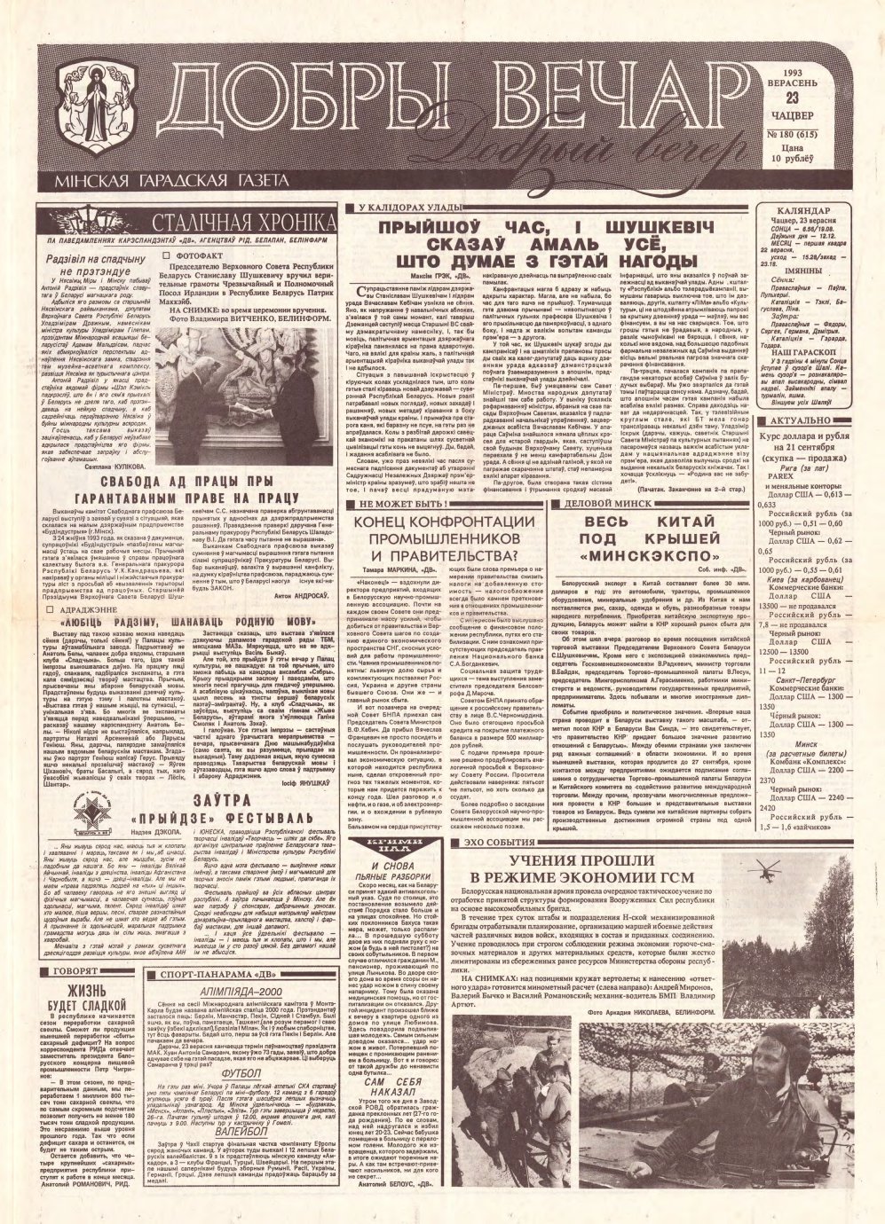 «Добры вечар» — мінская гарадская газета. Выдаеццап з лістапада 1990. Заснавальнік: Мінскі гарадскі Савет народных дэпутатаў. Аўтары змешчаных матэрыялаў нясуць адказнасць за падбор і дакладнасць прыведзеных фактаў, цытат, эканамічных даных, асабістых імён, геаграфічных назваў і іншай інфармацыі, а таксама за тое, каб у матэрыялах не ўтрымлівалася звестак, якія не падлягаюць адкрытай публікацыі. Допісы, атрыманыя рэдакцыяй, не рэцэнзуюц... Болей »