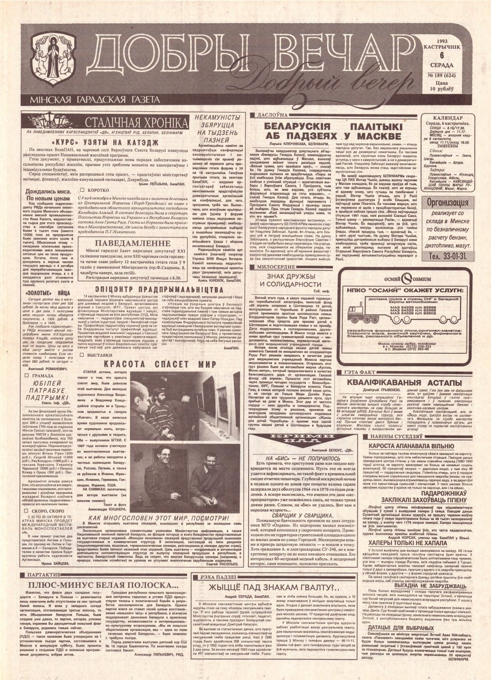 «Добры вечар» — мінская гарадская газета. Выдаеццап з лістапада 1990. Заснавальнік: Мінскі гарадскі Савет народных дэпутатаў. Аўтары змешчаных матэрыялаў нясуць адказнасць за падбор і дакладнасць прыведзеных фактаў, цытат, эканамічных даных, асабістых імён, геаграфічных назваў і іншай інфармацыі, а таксама за тое, каб у матэрыялах не ўтрымлівалася звестак, якія не падлягаюць адкрытай публікацыі. Допісы, атрыманыя рэдакцыяй, не рэцэнзуюц... Болей »
