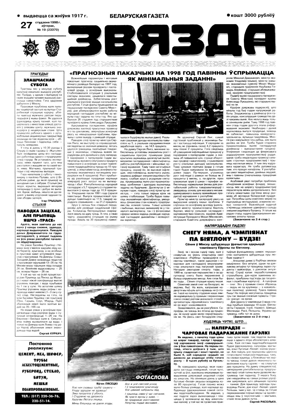 «Звязда» — Беларуская газэта. Выходзіць 250 разоў на год. Аўтары апублікаваных матэрыялаў нясуць адказнасць за падбор і дакладнасць фактаў. Іх меркаванні неабавязкова адлюстроўваюць пункт гледжання рэдакцыі. Болей »