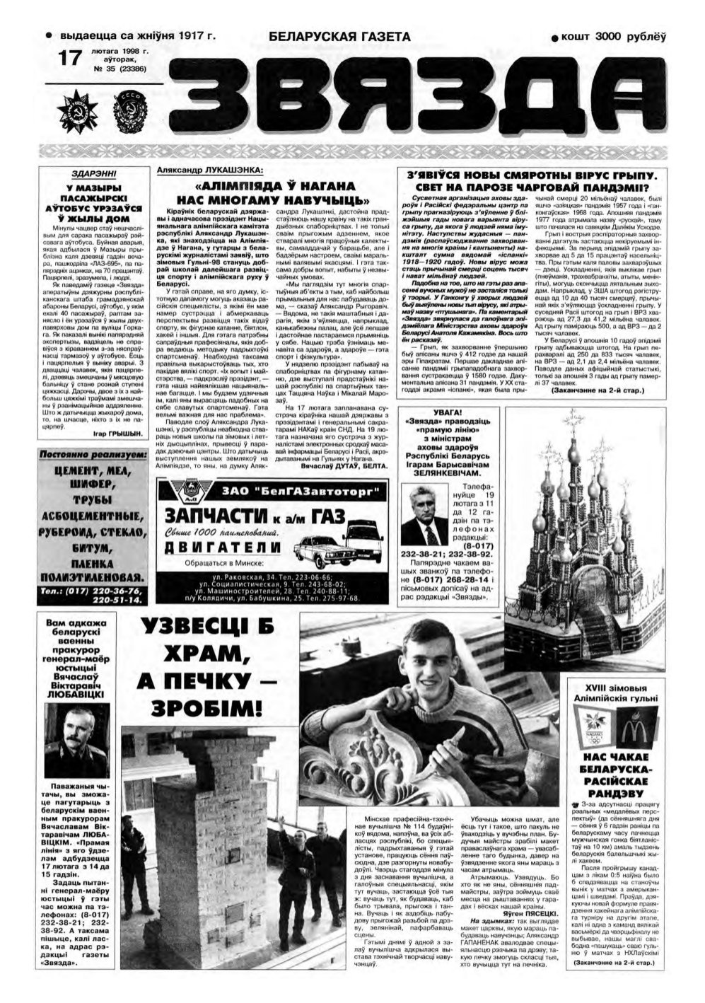 «Звязда» — Беларуская газэта. Выходзіць 250 разоў на год. Аўтары апублікаваных матэрыялаў нясуць адказнасць за падбор і дакладнасць фактаў. Іх меркаванні неабавязкова адлюстроўваюць пункт гледжання рэдакцыі. Болей »