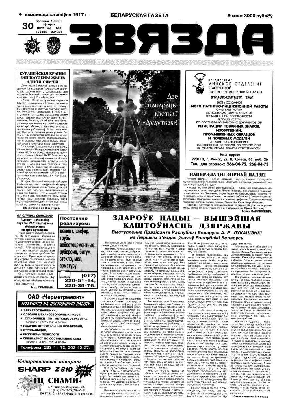 «Звязда» — Беларуская газэта. Выходзіць 250 разоў на год. Аўтары апублікаваных матэрыялаў нясуць адказнасць за падбор і дакладнасць фактаў. Іх меркаванні неабавязкова адлюстроўваюць пункт гледжання рэдакцыі. Болей »